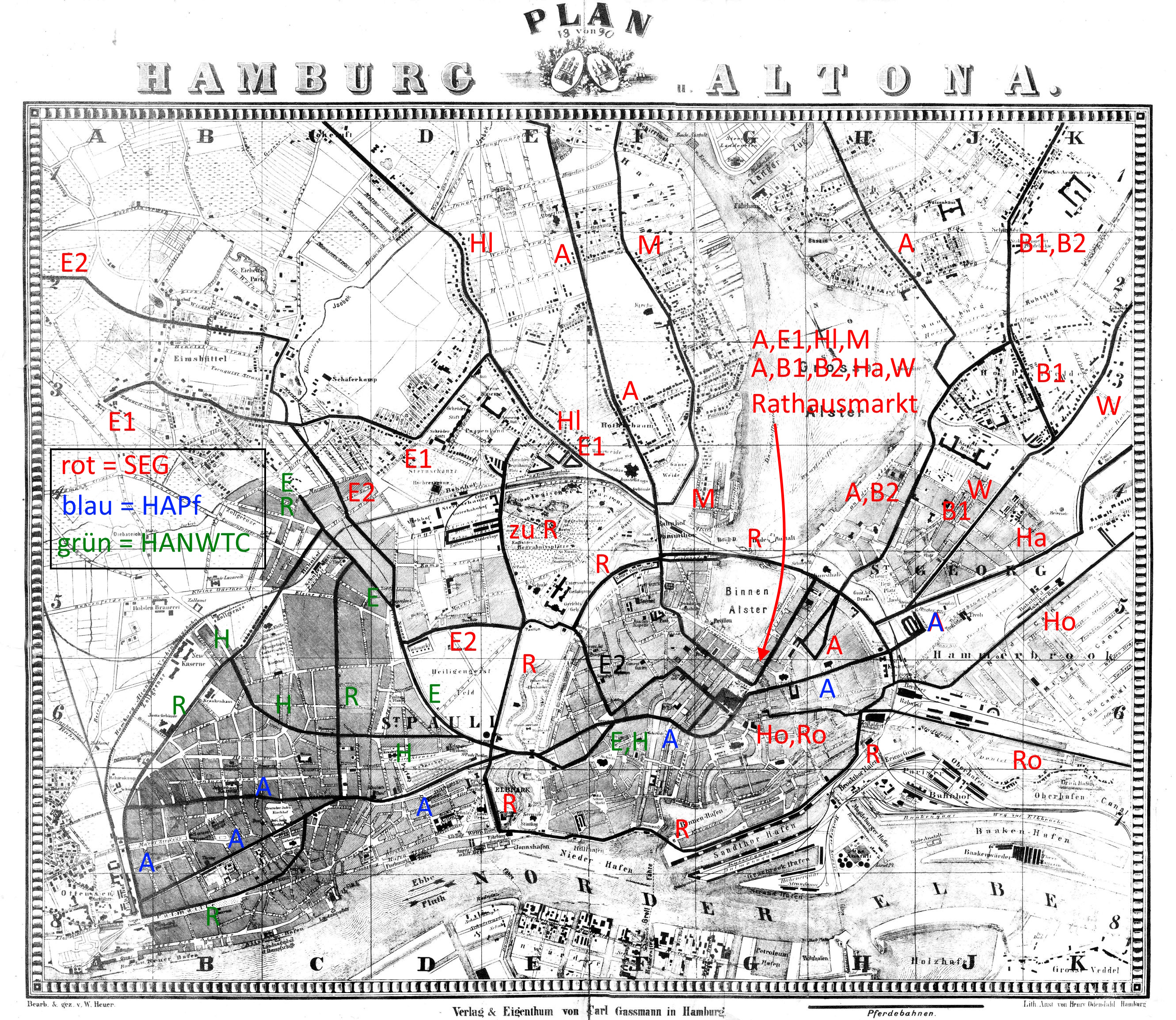 unterschieden. So bedeutet bei der SEG (rot) dann A = Alsterring, B = Barmbek, R = Ring um die Stadt usw.